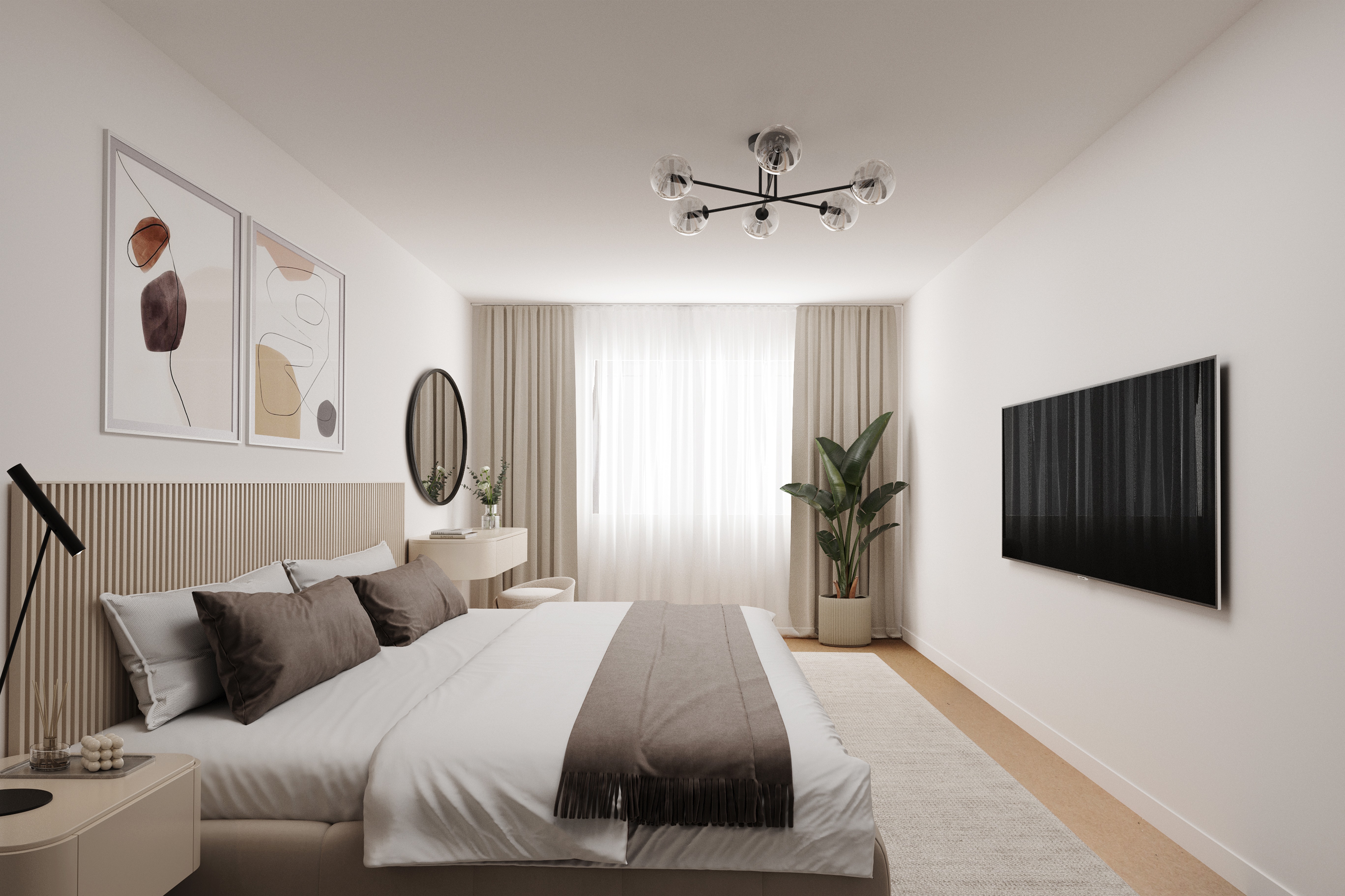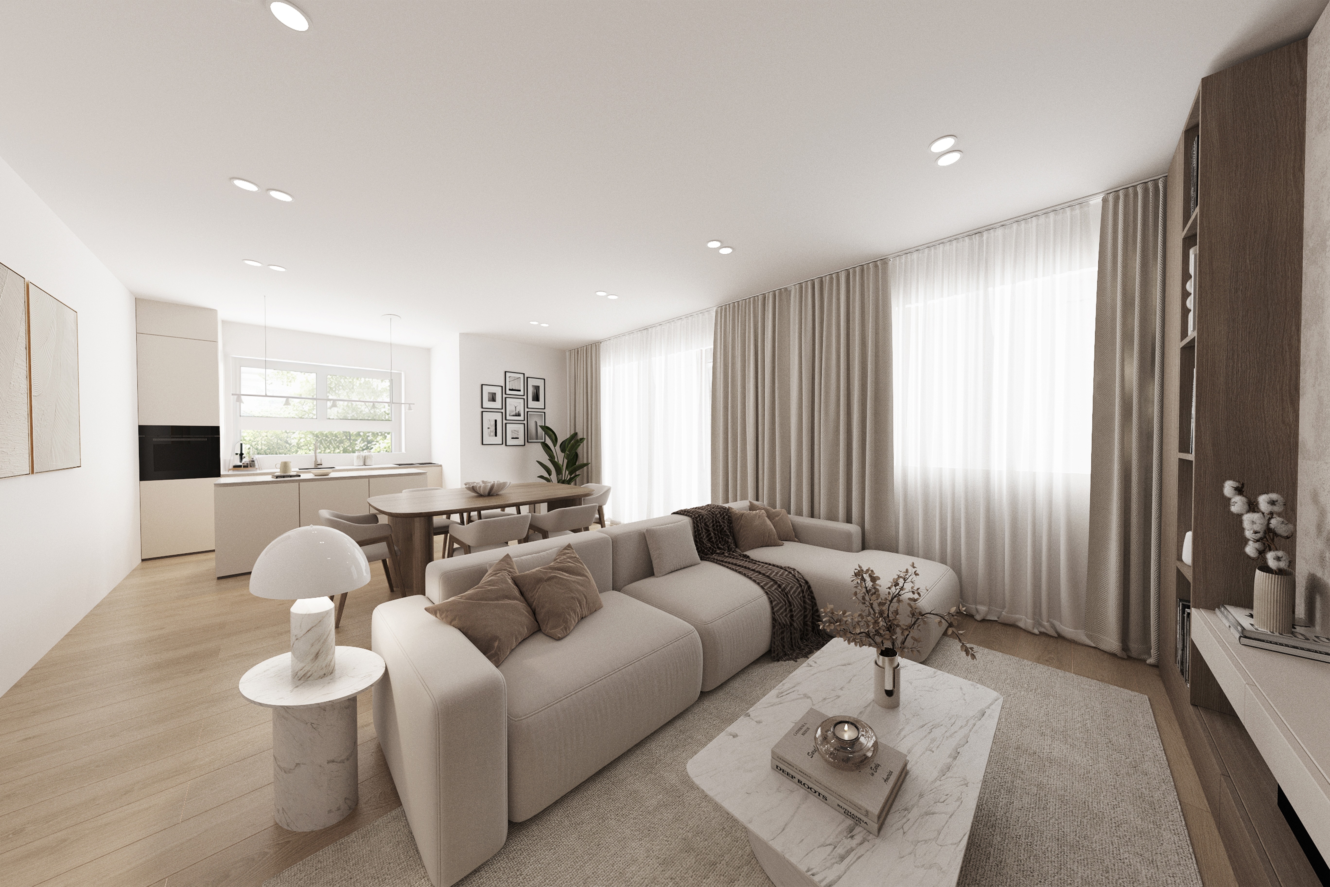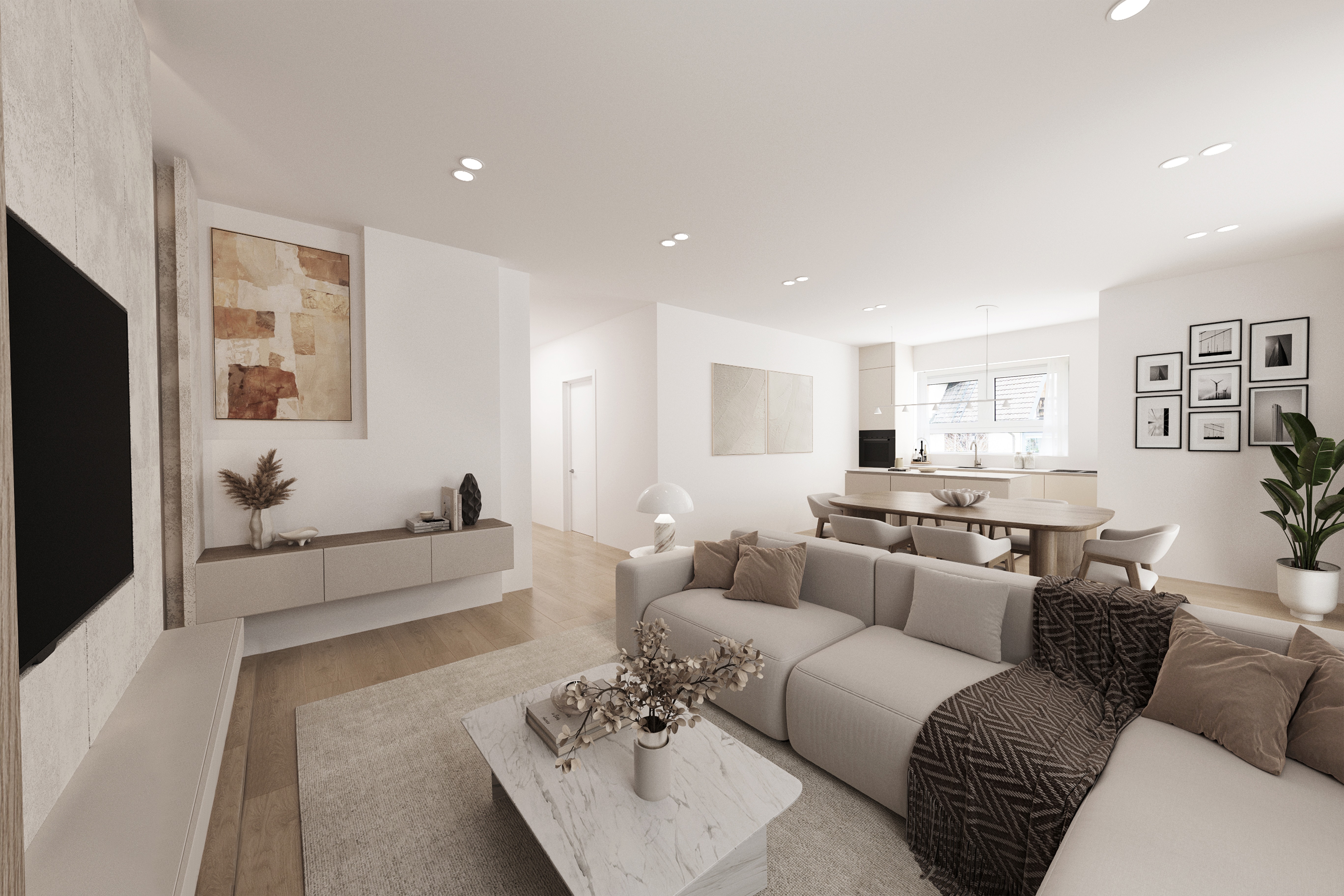 Die 54m² Wohnfläche der Wohnung verteilen sich auf insgesamt zwei Zimmer. Ein Schlafzimmer und ein Badezimmer bieten ausreichend Platz für Komfort und Gemütlichkeit. Der offene Wohn- und Essbereich mit direkten Zugang zum Südbalkon ist lichtdurchflutet und lädt zum Verweilen ein. Der Balkon bietet zudem die Möglichkeit, im Freien zu entspannen und die frische Luft zu genießen. Alle Räume verfügen über eine Fußbodenheizung.