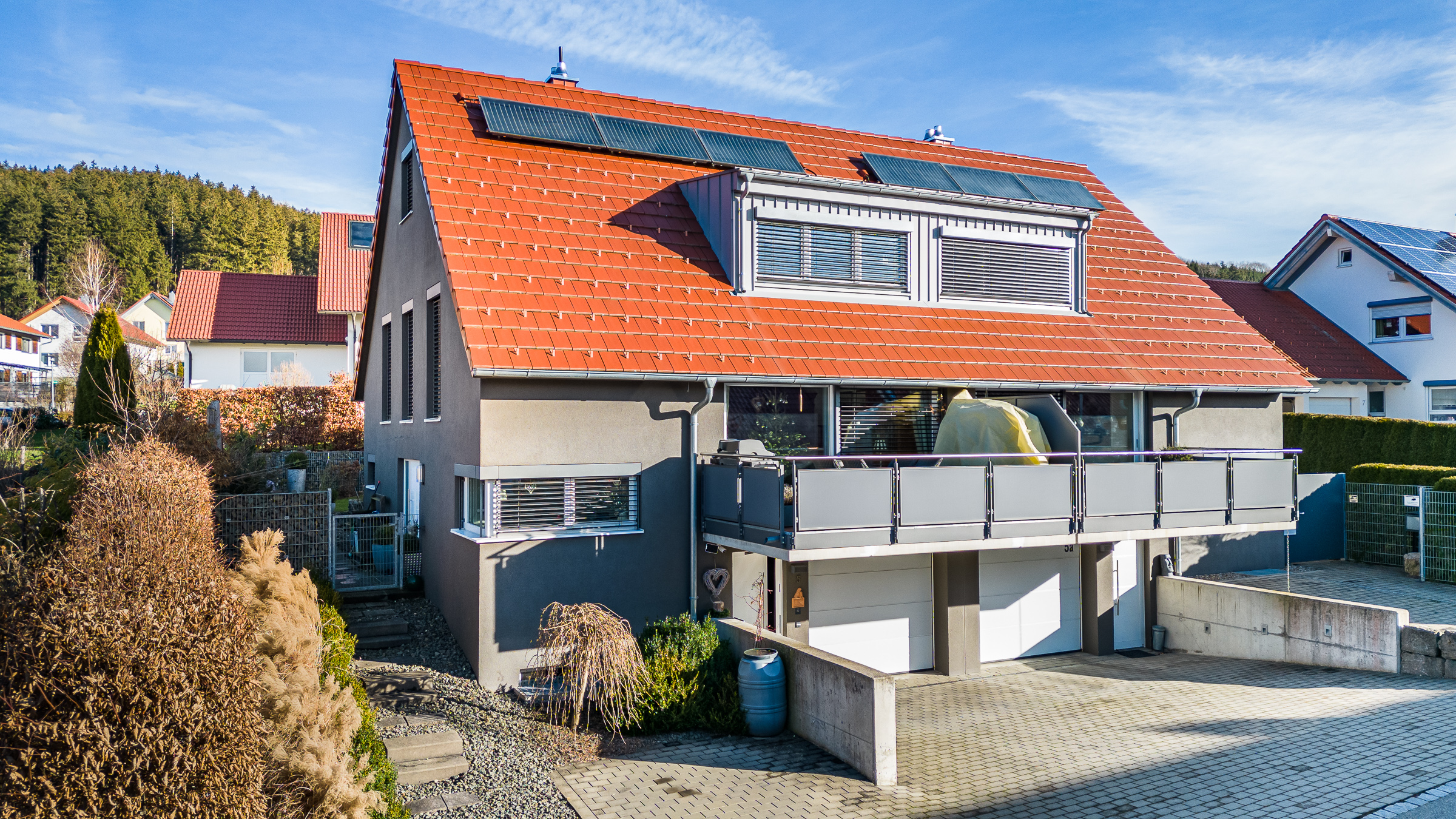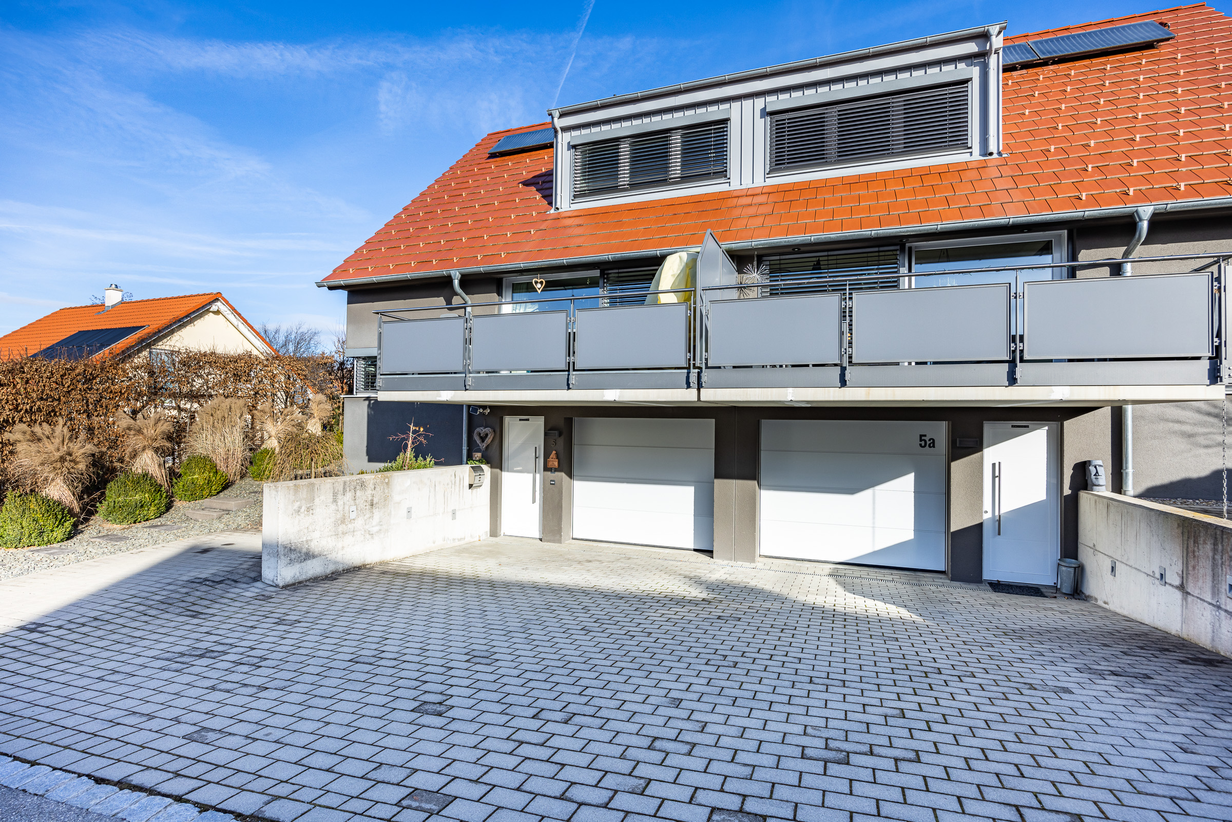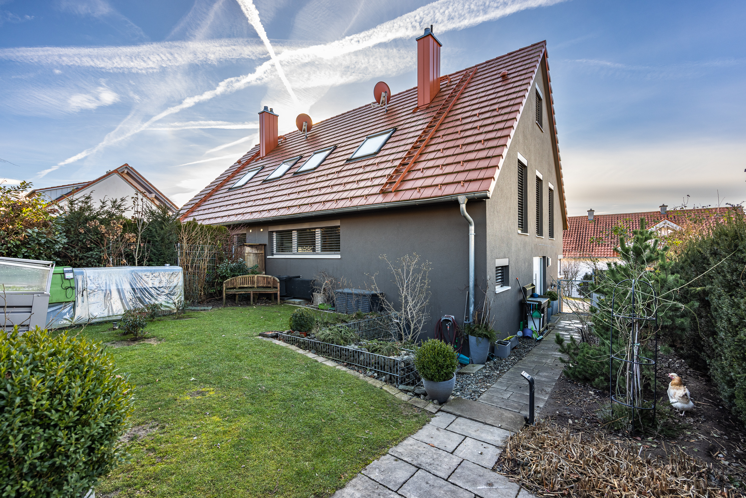 In der Garage finden zwei Autos hintereinander Platz. Vor dem Haus gibt es zwei weitere Außenstellplätze. Ein sichtgeschützter und pflegeleichter Garten mit einer kleinen Lounge-Ecke lädt zum Entspannen ein.